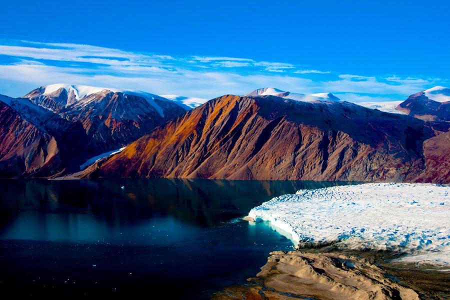 This whole area contains some of the Arctic’s most impressive scenery. Deep fjords and narrow channels, flanked by ice-clad peaks up to 2000 meters high, reach far into the mountainous heart of Greenland. Tidewater glaciers create colossal icebergs that float with wind and tide throughout the fjord system. On shore, fields of multicolored tundra are home to musk oxen and Arctic hare. The landscape—vast, open, and seemingly untouched since the beginning of time—is a hikers’ paradise. Throughout this area we also find ancient Thule archeological sites, historical trappers’ huts, and modern Inuit hunters’ cabins.