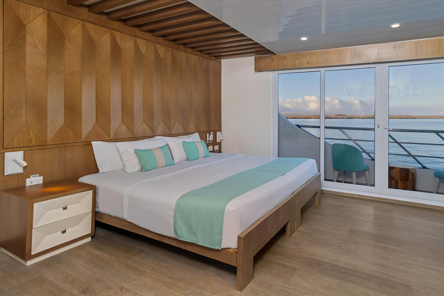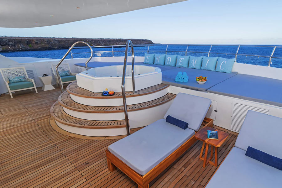 The M/C Endemic has a capacity for 16 passengers, eleven crew members plus guide, offering a service ratio of almost one to one. Being the first catamaran of a new generation of catamarans, the Endemic gathers elegant exteriors, spacious areas for high-end accommodation, social, and open areas. Navigations between the islands are sleek and fast due to Endemic’s design which delivers transverse stability when cruising around the Galapagos Islands archipelago. On the Main Deck, the Endemic in the front features a briefing area for briefings, lectures, and it is also the point of information for Galapagos travel with videos, books, and personalized assistance. The interior passengers lounge and dining area offer also panoramic view of the islands during navigations and excursions, while enjoying exquisite cuisine. Two platforms allow passengers on and off the catamaran, offering super easy access to the yacht. The Upper Deck has four suites, a sun terrace and a secluded social area for relaxation and wildlife observation. The Endemic also has a single cabin with private balcony. On the Sky Deck, the Endemic features al fresco dining, bar, exterior lounge, BBQ, jacuzzi, sun chairs and seating area where delicious drinks are served while enjoying the islands.