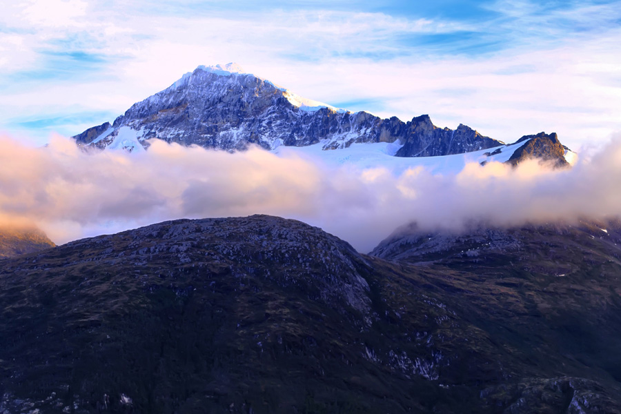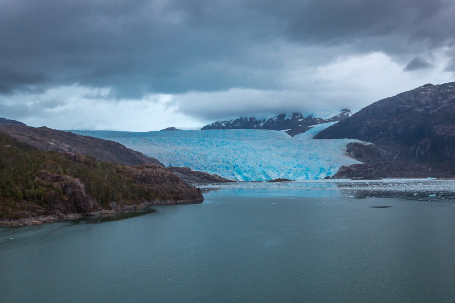 Entering Peel Fjord from the Sarmiento Channel in southern Chile, your ship veers into the branch called Asia Fjord. As you cruise deeper into the fjord, the water’s surface is dappled with floating ‘bergie bits’ of ice, and occasional larger growlers. Meanwhile the steep slopes on either side are tinseled with lacy waterfalls flowing from the snow-frosted peaks above. Ahead, two ochre slopes cradle a glowing blue-white face of cracked and fissured ice two kilometers across and hundreds of feet high, spilling with geologic slowness from the South Patagonian Ice Field far up the valley. Occasionally a huge shard of ice falls silently into the sea, followed seconds later by the delayed sound of its crack and thunder. You are in the midst of Chile’s Bernardo O’Higgins National Park, the nation’s largest protected region.