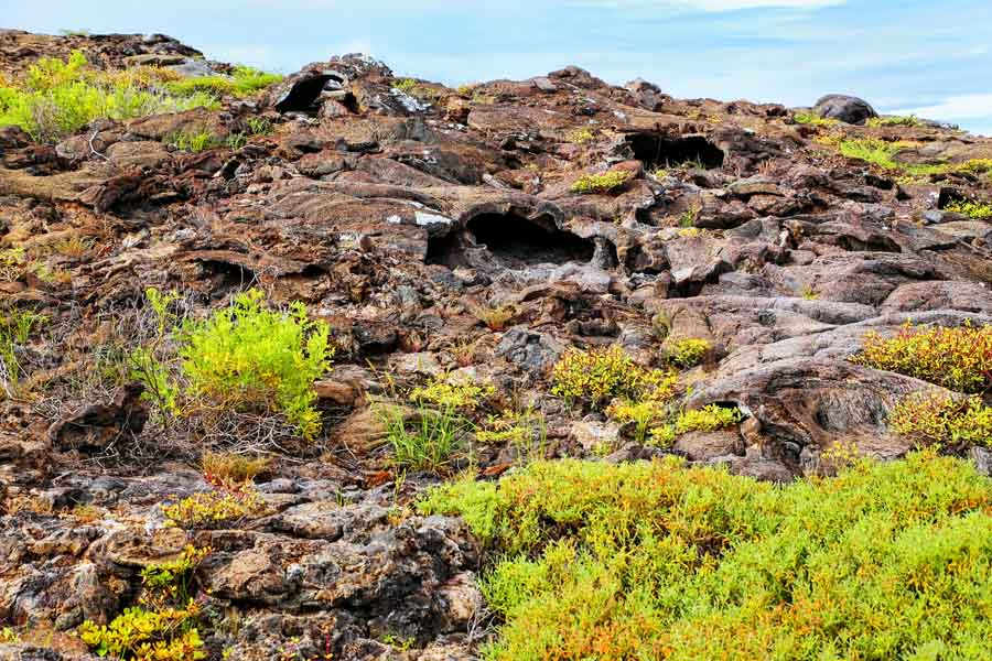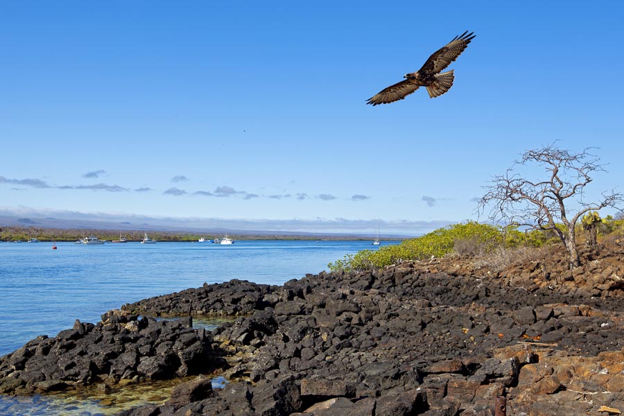 In the afternoon, you will explore Moreno Point, known for its otherworldly rocky shoreline that is home to dozens of different bird species, making it a paradise for birdwatchers. You can hike to the saltwater lagoons just off the beach, where you will find more unique bird species. The contrast of jet-black lava flows with the deep blue waters, the bright green vegetation surrounding the lagoons, and the towering Sierra Negra and Cerro Azul volcanoes off in the distance make Moreno Point a particularly stunning, picturesque location to visit.
