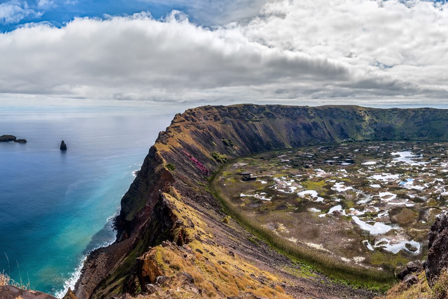 This morning you will leave the hotel and head to Cerro de Pui. Here, you begin the hike at the foot of the hill, known for the Haka Pei competition, in which Rapa Nui slide down the hill using toboggans fashioned from banana tree trunks. The trail continues through the fields, passing various archaeological sites before arriving to Ranu Raraku, the Moai quarry. Most of Easter Islands 900 moai come from the slopes of the Rano Raraku volcano. After enjoying the amazing landscape, return to the hotel by van for lunch.