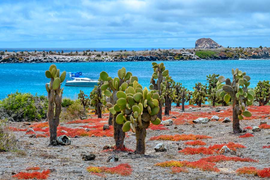 Santa Fe is home to a variety of endemic species, including the Galapagos hawk, Galapagos snake, Galapagos mockingbird, rice rats, and one of the two species of land iguanas found in the islands. Upon disembarking into the crystal-clear waters, you'll encounter one of the many sea lion colonies inhabiting the area. Along the trail, you'll observe numerous salt bushes and towering giant prickly pear cacti, characteristic of oceanic island gigantism. Don't miss the opportunity for snorkeling among playful sea lions and vibrant tropical fish.