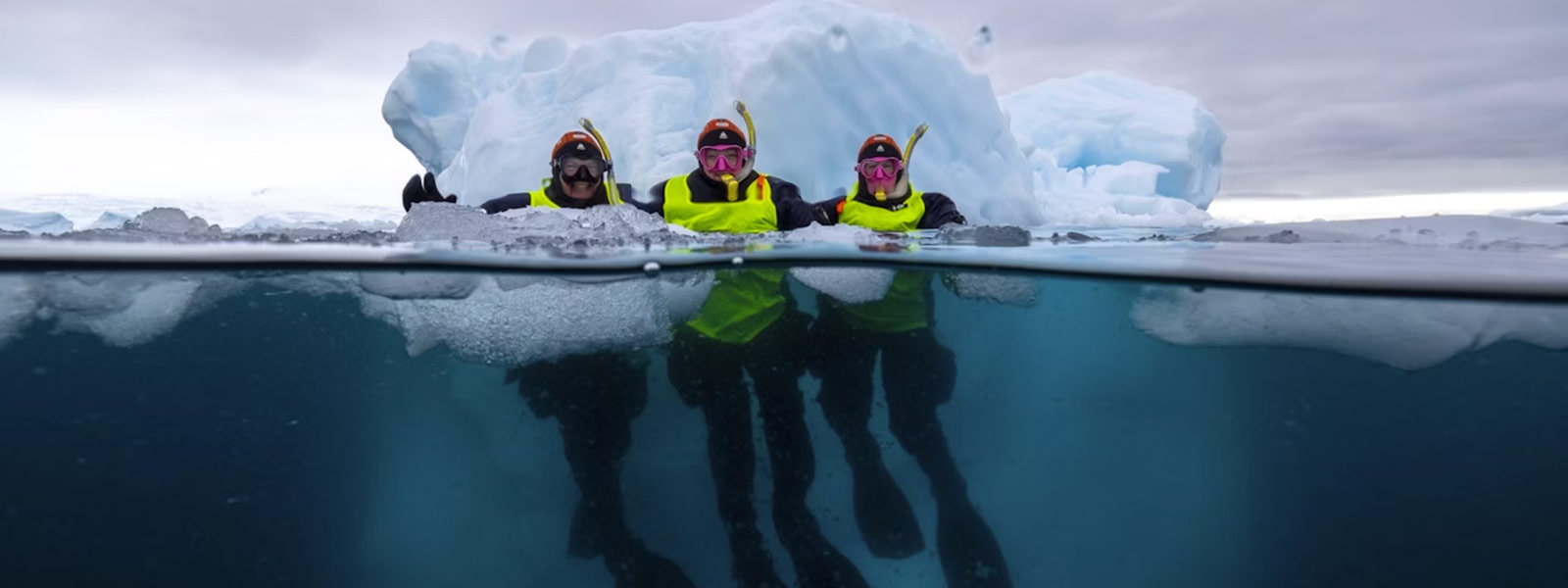 Snorkeling in Antarctica is a unique experience that will allow you to see Antarctica in a completely new dimension, witnessing wildlife and scenery unlike any other place on earth. Through crystal clear waters adventurers will discover the amazing mobility and speed of penguins entering and exiting from the ice, marvel at the beauty of sculpted icebergs below the water and also witness marine life such as crustaceans, isopods, starfish and nudibranchs.