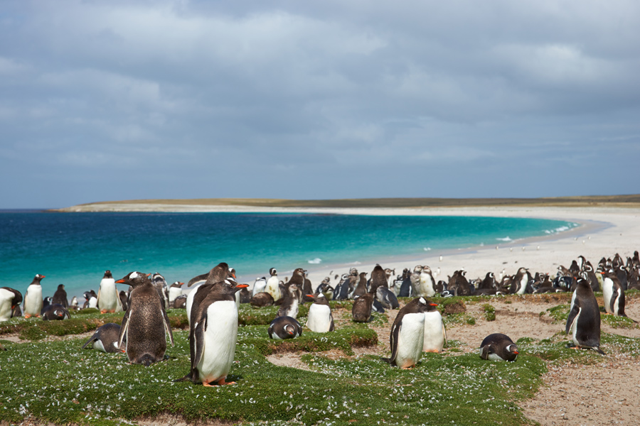 We continue our exploration of the Falklands in the isolated outlying islands. These bleakly beautiful isles are havens for wildlife. Large colonies of seabirds, perched on windy bluffs overlooking azure seas, are easily accessible by hiking over lush meadows. At this time, black-browed albatross soar down from above while feisty rockhopper penguins leap up surf-battered cliffs from below to feed their large chicks amongst the tussocks.