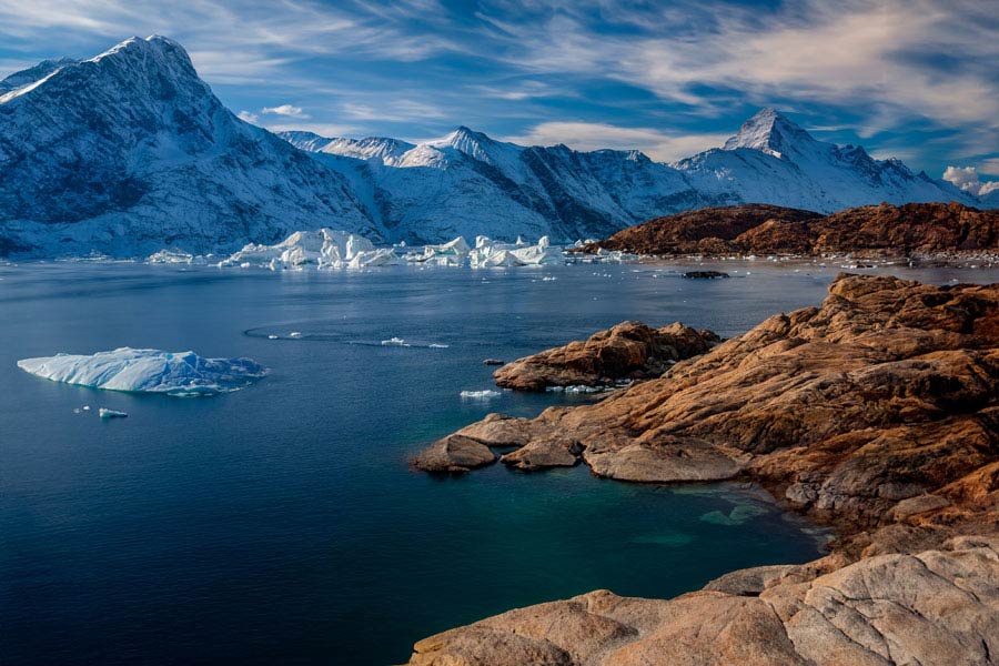 Farther south along Greenland’s east coast, the scenery grows wilder and more intricate. Mountains lean over the sea, glaciers split and tumble, and icebergs turn slowly in calm fjords the colour of steel and turquoise.