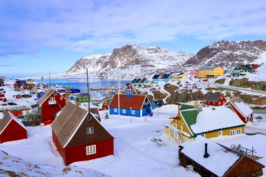 The small city of Uummannaq sits perched precariously at the foot of a massive mountain. Like the rest of the area, here the mountain reaches vertically out of the icy depths, punching 1170m into the clear blue sky. Uummannaq mountain (translated from Greenlandic as “heart shaped”) is a true Greenlandic icon, and is a mecca for climbers who visit from all over the world. The city itself occupies a small area of flatter ground at the foot of the mountain, founded by Danish colonists in 1763 – some of the original buildings from this era can still be visited in the harbour-front area. More recently, Uummannaq has become famous in Scandinavia as the home of Santa Claus – the small turf house belonging to the festive hero himself can be reached via a pleasant (if challenging) 2-3h hike out of town.