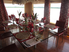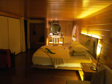 Our Delfin guide located us at the airport while we waited for the other guests to come off their flight from Lima. We were then transferred to Nauta in a small minivan (air conditioned and water provided) – the drive was about 1.5 hours. We pulled up at a beautiful reception office near the banks of the river and were given a welcome drink and a refresher towel. It was a large thatched but open area with lovely comfortable lounges and décor. We completed our registrations and were then lead down a wooden stairway to a skiff and taken about 10 metres to the boat. Our luggage had already been taken to the boat and delivered to our cabins. We were shown to the cabin (deluxe master suite with private spa) and OMG – I had checked out the website but it was still quite unbelievable. I think there were tears in my eyes and I think Lou squealed like a little girl – eeeeeeeeee!! We didn’t have time to enjoy it right then as we were required on the top deck for an emergency evacuation lecture and afterwards it was dinnertime. The dining room was on the middle level and what came out of the kitchen was amazing.