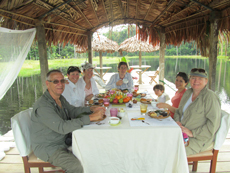 The program of the day to day activities are similar to what happens at the game lodges in Africa and if you haven’t been to Africa this is what happens… We were up at 5.30/6.00 each morning to go out on an early morning skiff ride. Tea and coffee available before we left. The Delfin would be docked on the main river and we would go on the skiffs mainly up and down the smaller tributaries. We would go out for 1-2 hours looking for birdlife, sloth, river dolphins, iguana, caiman, a few different species of monkey etc. There were so many different varieties of birds. I would definitely recommend a good camera and very good binoculars. After an hour or so we would be back the boat for breakfast and then out again at 10.00-11.00 for a couple of hours, then back to the boat for lunch, a bit of a rest and then out again until late afternoon. It wasn’t always just on the skiff; we fished for piranha, went swimming in an area where the dolphins were hanging out, we went kayaking, we went for walks on terra firma around lagoons looking for anaconda (with a guide who had a machete – very safe), we went on a canopy walk through the rain forests roof top, to a local village where the ladies had set up a market then back to the boat for dinner. One morning’s breakfast was on a pontoon in the middle of a lagoon; it was just magical. Birds everywhere, monkeys playing in the trees over on land. The attention to detail was incredible for the remoteness of where we were.